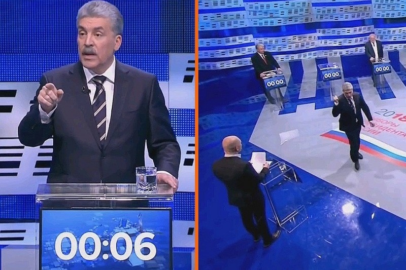 Вы жаловались на скучные российские выборы?! Так получайте шоу! То Владимир Жириновский отжигал на «голубом экране» на пару с Ксенией Собчак: он матерился, она – поливалась водой. Теперь концерт по заявкам закатил бизнесмен Павел Грудинин. Он ушел из студии во время дебатов на «Первом канале». Не выдержали нервы спора о будущем России. - У каждого кандидата есть заключительное слово на две минуты - Павел Грудинин, - озвучил телеведущий Анатолий Кузичев. - Мне очень приятно, что все кандидаты, которые здесь стоят, прочитали нашу программу и растащили ее на свои тезисы, - начал Грудинин. Но тут без очереди вклинилась Ксения Собчак: - Вам не стыдно? Вы ролик сняли как у меня! И тут Грудинин "поплыл". - То, что здесь происходит - это не дебаты. Это базар, - завелся бизнесмен. - Это какие-то крики с места. Дебаты - это когда ты споришь с соперником. Это интервью. И зачем мы по часу стоим, хотя у нас только 6 минут, необъяснимо никому. Вы получили от нас письмо. Мы предложи