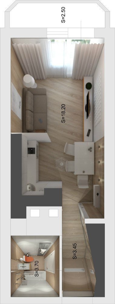 Минимализм или ещё можно сказать, дизайн в стиле "аскетизм" - подходит для людей, которые предпочитают не баловать себя лишним. Проект квартиры-студии в 27 метров с дизайном в стиле минимализм. Здесь нет лишних комодов, диванов, только всё, что нужно для проживания. Общий план квартиры Прихожая на 3,5 метра, справа размещен шкаф купе для хранения вещей, слева вход в ванную комнату. Может только смущать проход из прихожей в кухню. Ванная комната (3,7 метра) Кухня Комната (18,2 метра) Хороший дизайн, для молодых людей, предпочитающих не проводить время дома.