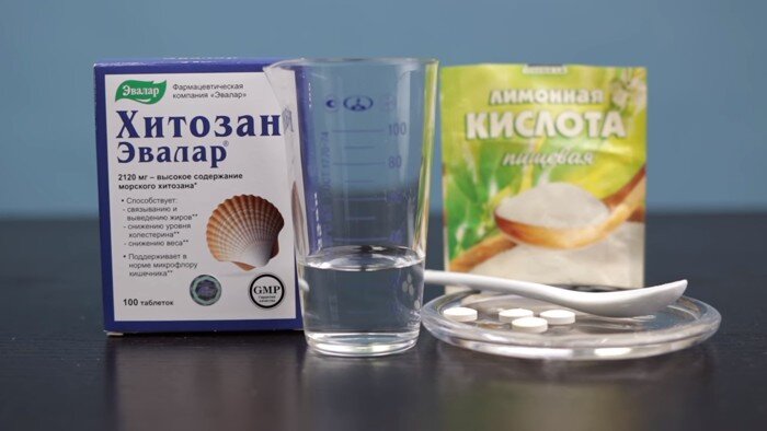 - В 10 мл теплой воды добавить 4 измельченные таблетки хитозана и размешать.