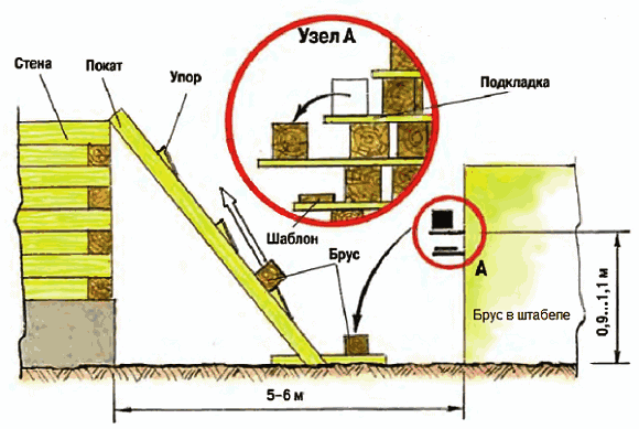 Разметку бруса с помощью шаблона удобно выполнять на высоте 0,9 — 1,1 метра в зоне разметки, узел А на рисунке. После разметки брус опускают на низкие подкладки в зону раскроя. В таком положении брус удобно и безопасно пилить цепной пилой.