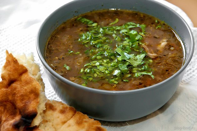 Дила мшвидобиса! Грузинская кухня. При произнесении этого словосочетания в мозгу возникает куча ассоциаций. Тут тебе и свежий горный ветер, и прохлада долин, откуда доносится блеяние овец и журчание горного ручья. А шум настоящего грузинского застолья вообще ни с чем не спутаешь — с цветастыми тостами, завораживающими песнями, здоровой пищей и замечательным вином. В общем, решили сварить харчо. Рецептов данного шедевра в сети оказалось довольно много, но самым большим шоком было то, что оказывается, харчо не делается из баранины.Название данного блюда по-грузински — «дзрохис хорци харшот», переводится как «суп из говядины». А нам всю жизнь в советском общепите скармливали некий «харчо из баранины», что, как гласит кулинарный словарь Похлёбкина: «...вопиющая кулинарная безграмотность и, главное, искажение представления о национальном грузинском блюде. » Настоящий харчо состоит из трёх обязательных ингредиентов: говяжьей грудинки (реже рульки), грецких орехов и тклапи. Тклапи — сухофрукт