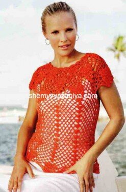 Размеры топа: 34-36 (40-42). Топ выполнен крючком. Вам потребуется: 300 (350) г пряжи Linie 275 MELOA оранжевого цвета Fb. 02; крючок № 3-3,5. Основной узор: Вязать согласно схеме. Точные объяснения следуют в описании ниже. Плотность вязания: 1 раппорт и 10 р. = 9,5 х 9,5 см. Вязать сверху вниз.