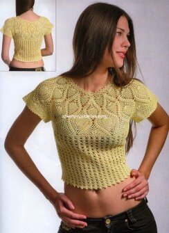 бъем груди: 85 см Вам потребуется: 200 г пряжи (100% хлопок); крючок № 1,5. Топ вяжется крючком по кругу. Начать с выреза горловины и вязать крючком согласно схеме 1. Связать крючком цепочку из 190 петель и обвязать её крючком 3 рядами ободков из 5 петель, всего должно быть 48 ободков. Далее 17 см вязать согласно схеме 1: всего должно получиться 12 раппортов «листочков» и 3 ряда «листочков». Отделить петельки, предназначенные для рукавов, и вязать только рукава. Для рукава на уровне проймы связать цепочку из 20 петель, соединить оба края рукава и продолжить вязание по кругу в соответствии со схемой 2. Перед и спинку вязать вместе по кругу узором согласно схеме 3. Сначала повторить 1-й и 2-й ряды. Затем вязание постепенно сузить: между столбиками уменьшить количество петель, повторяя 3-й и 4-й ряды. [cut]