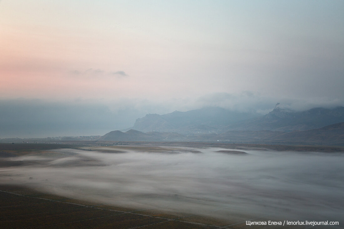 Наше прощальное крымское утро мы встретили на Узун-Сырте ( горе Клеменьева). Собственно приехали мы туда накануне вечером, от души нагулялись, даже немного поснимали планеристов. Вечером были посиделки у камина и разговоры, разговоры, разговоры.. А утром все вокруг взял в плен туман. Надежда на красивый рассвет таяла с каждой минутой. Туман на глазах все больше и больше заливал всю долину, перетекая от края к краю. В какие-то моменты даже скалы Кара- Дага переставали быть хоть как-то видны
