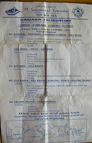 Идея добраться на Комодо с Гили Траванган на корабле появилась еще в далеком 2008 году, когда во время первого посещения этих райских островов, на Гили Эйр мне в руки в одном из дайв-центров попала эта мятая листовка.