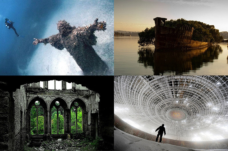 Статуи, дома, целые города и деревни, где уже давно не ступала нога человека. Подобных мест на нашей планете довольно много. Здесь не живут люди, и природа понемногу начала заявлять права на эти постройки. Отличные декорации для пост-апокалиптического фильма. 3.Заброшенные купольные дома в юго-западной Флориде. 4. Обломки корабля "Ayrfield" в заливе Хомбуш, Австралия. 5. Заброшенный парк развлечений недалеко от Пекина. 6. Рыбацкая хижина на озере в Германии. 7. Голландский остров в Чесапикском заливе. 8. Пешая дорожка между Сним и Кенмаре в Ирландии. 9. Припять, Украина. 10. Монастырь 15 века в Черной крепости в Германии. 11. Калавантин Дург рядом с Панвелом, Индия. 12. Обломки самолета "Пегас" в заливе Мак-Мердо, Антарктида. 13. Ангкор Ват в Камбодже. 14. Форты Манселла у берегов Англии. 15. Замок Бодиам в Восточном Суссексе, Англия. 16. Заброшенное депо метро в Цинциннати. 17. Затонувшая яхта в Антарктиде. 18. Заброшенный спиртогонный завод в Барбадосе. 19. Зал Хафодунос в Л