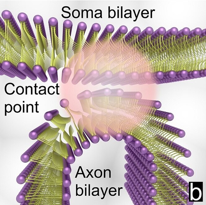 Физики и нейробиологи из канадского Университета Альберты нашли способ приваривать аксон одной нервной клетки к телу другой. Для этого они использовали фемтосекундные лазерные импульсы. Результаты эксперимента опубликованы в Scientific Reports. Точка соединения нейронов. Иллюстрация из обсуждаемой статьи. «Свариваемые» нейроны точно подводили друг к другу (с точностью до 0,5 мкм), и в точку соединения «выстреливались» титан-сапфировым лазером с длиной волны 800 нанометров 1,2 миллиона импульсов за 15 миллисекунд, достигая плотности энергии в 1,71х1012Вт/см2. Эти импульсы приводили к ионизации наружного слоя мембран, разрывая их гидрофобные слои, что приводило к объединению мембран двух нейронов. В результате эксперимента удалось собрать небольшие сети из жизнеспособных нейронов (см. рисунок), соединенных прочными связями, которые сохранялись при перемещении групп клеток. Соединенные нейроны. Иллюстрация из обсуждаемой статьи Текст: Алексей Паевский Novel Method for Neuronal Nanosur