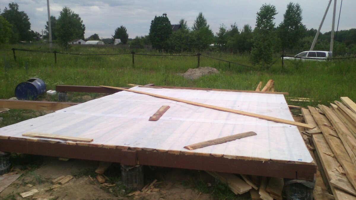 Летом 2016 года я научился вызывать дождь с помощью дешевой огнебиозащитной пропитки из Леруашки. Всякий раз, когда я что-то пропитывал, откуда-то появлялись тучи и начинал идти ливень. После того как я пропитал доски чернового пола - зарядил дождь и, должно быть, вымыл всю пропитку. Я хотел пересидеть его в туалете сарае, но дождь пошел криво и смог достать меня даже там. Пришлось уехать домой. В тот же вечер выглянуло солнце которое светило вечером и весь следующий день. Когда я решил, что доски должны были бы просохнуть, я поехал укрывать их пароизоляционной пленкой. Только я пристепплерил последнюю скобу - с неба опять покапало. На этот раз дождик намочил пароизоляцию (белая пленка на фото) и еще раз освежил доски под ней. Я плюнул и решил: а. продолжать строить б. ничего не пропитывать до появления крыши, потому что какой смысл. Невымываемую пропитку я тогда почему-то не купил. Дальше я собрал периметр и выставил лаги основного пола. Сейчас я понимаю, что многое делал неправил