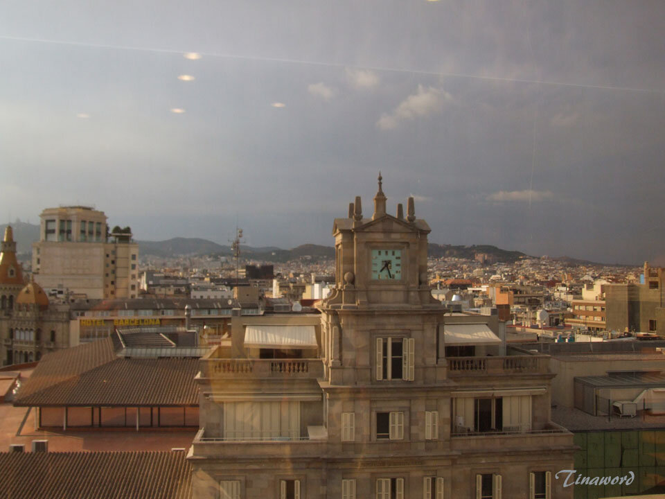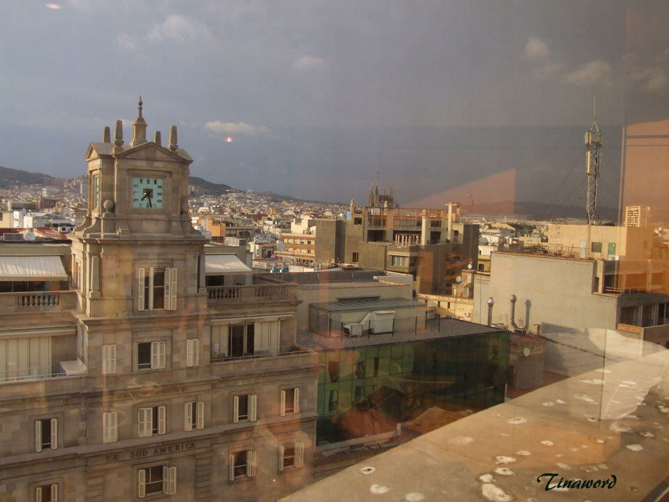 Экскурсия на "Волшебные фонтаны" была совмещена у нас с посещением супермаркета El Corte Inglés на Plaza Catalunya. Думаю, что экскурсоводы имеют свой процент от того сколько клиентов они приведут в магазин, но может быть это мои домыслы. Первое куда нас привела экскурсовод в супермаркете был отдел, в котором нам выдали карточки бесплатного посещения кафе на 9 этаже и скидочную карточку. Времени в магазине у нас было не много, зашли только в пару отделов, в которых нам объяснили, что эта скидочная карточка на товары не из этих отделов... так что мы этой карточкой не воспользовались. Но в кафе нам, по выданной в первом отделе карточке, налили по бокалу красного столового вина и дали маленькую - при маленькую котлетку. Главное в этом кафе были виды, которые открывались из окон кафе. Вдали виднеется собор Святого семейства