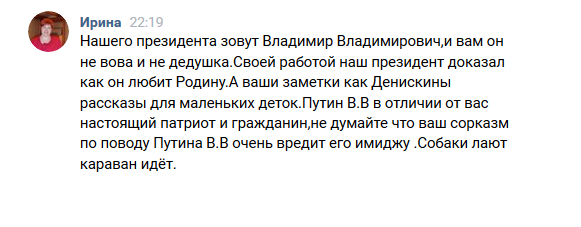 Вот и первая рецензия на мой вчерашний пост «Пустое послание Путина» пришла: «Он вам не Вова и не дедушка». Такой вот «сОрказм». Видимо она совсем ярая сторонница Вовы, что даже не смогла просто пройти мимо поста, и сразу решила мне в личку написать, отреагировать. Такая вот женщина, вот фото с ее страницы в ВК: Наверняка учительница какая-нибудь, или сотрудница какого-нибудь государственного учреждения, раз Вову так сильно любит, даже рецензии пишет на посты, реагирует на критику государя, и очень похоже, что искренне. Скорее всего, информацию она черпает только из федеральных каналов и всей душой верит в любую официальную пропаганду. И очень-очень любит дедушку Вову. Такой вот «сорказм».
