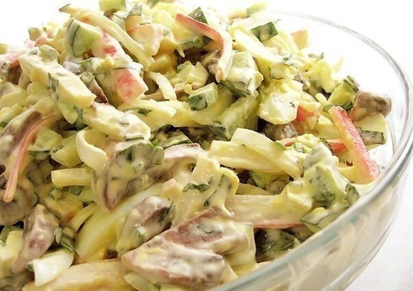 750 г шампиньонов400 г крабовых палочек5 крутых яиц4 свежих огурцамайонеззелень петрушки1-2 шт. репчатого лука