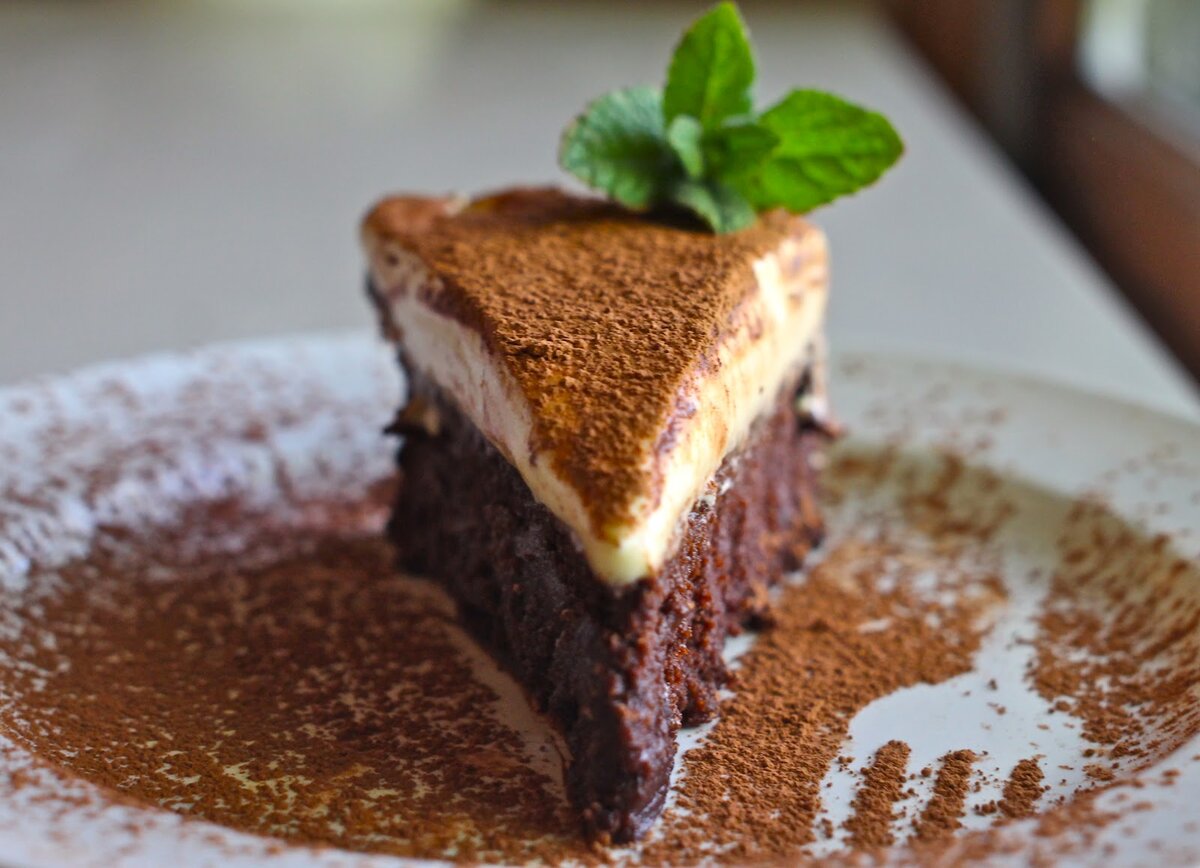 Нежное лакомство. Ингредиенты: Шоколад горький 220 грамм Масло сливочное 220 грамм Сахар 1 стакан Яйца куриные 6 шт. Какао-порошок ½ стакана Ванилин 1 чайная ложка Соль 1 чайная ложка Тёплая вода 1/3 стакана Кофе растворимый 1 столовая ложка Для мусса из белого шоколада: Шоколад белый 165 грамм Разрыхлитель 3 столовых ложки Масло сливочное 3 столовых ложки Желток 4 шт. Сахар 2 столовых ложки Ванилин 1 чайная ложка Сливки жирные 1,5 стакана Сливки жирные 2 столовые ложки (для шоколадной смеси) Приготовление: Разогреть духовку до температуры 175 градусов. Застелить пергаментной бумагой форму для торта. Масло сливочное растопить, добавить кусочки шоколада, помешивать, пока шоколад не растопится. В тёплой воде растворить кофе, добавить ванилин и соль. Добавить к шоколадной смеси. Тем временем яйца взбить с сахаром в течение 5 минут (масса должна увеличиться вдвое). Добавить какао-порошок и смешать до однородной массы. Соединить 2 смеси. Тесто перелить в форму для торта и отправить выпекат