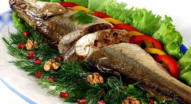 Приготовление. 1. Сначала подготовим рыбу. Выпотрошим судака, перерубим ему позвоночник у хвоста и головы и удалим кости. Удалите жабры из головы. Теперь нужно очень хорошо промыть рыбу, посолить ее и выдержать тридцать минут в холодильнике. 2. Измельчите грецкие орехи в блендере или пропустите их через мясорубку. Соедините их с перцем и солью, нарезанным мелко луком и зернами граната. 3. Данным фаршем нужно нафаршировать рыбу. Зашейте брюшко рыбы и выложите ее на промасленный большой противень. Запекайте в горячей духовке до полной готовности рыбы. 4. Подавайте на красивом блюде с зеленью. Можете украсить поверхность рыбы майон