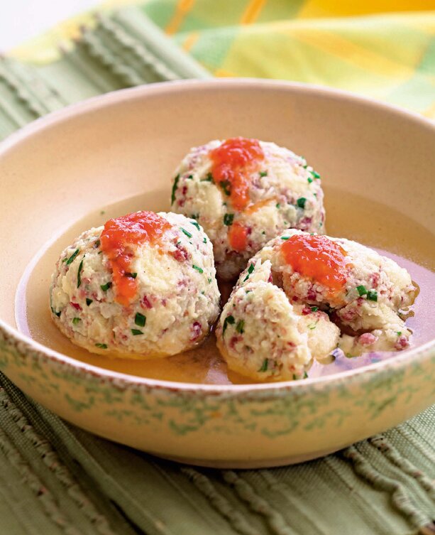 ВРЕМЯ ПРИГОТОВЛЕНИЯ: 30 минут Ингредиенты: 500 г черствого белого хлеба без корки 2 яйца 2 стакана молока 1 зубчик чеснока 200 г копченых мясных изделий 1 луковица 1 ст. л. муки 2 ст. л. томатного соуса 1 веточка петрушки горсть пармезана соль, перец бульон овощной или куриный сливочное масло Приготовление: 1. Хлеб нарезать кусочками, замочить в молоке и оставить на ночь. Мясные изделия провернуть через мясорубку. Лук, чеснок и петрушку измельчить и обжаривать на растопленном сливочном масле 4 мин. Снять с огня, добавить размоченный хлеб, яйца, ложку муки и приготовленный мясной фарш. Попробовать на вкус и, если надо, добавить соль, перец и пармезан. Тщательно перемешать. 2. Скатать из получившейся массы шарики размером с бильярдный шар. Выложить на поднос, накрыть пленкой и поместить их на 1 час в холодильник. 3. Бульон довести до кипения. Положить приготовленные шарики (из расчета 2 шт. на 1 человека), готовить на слабом огне 10–15 мин. 4. Разложить по тарелкам, залить бульоном и укр