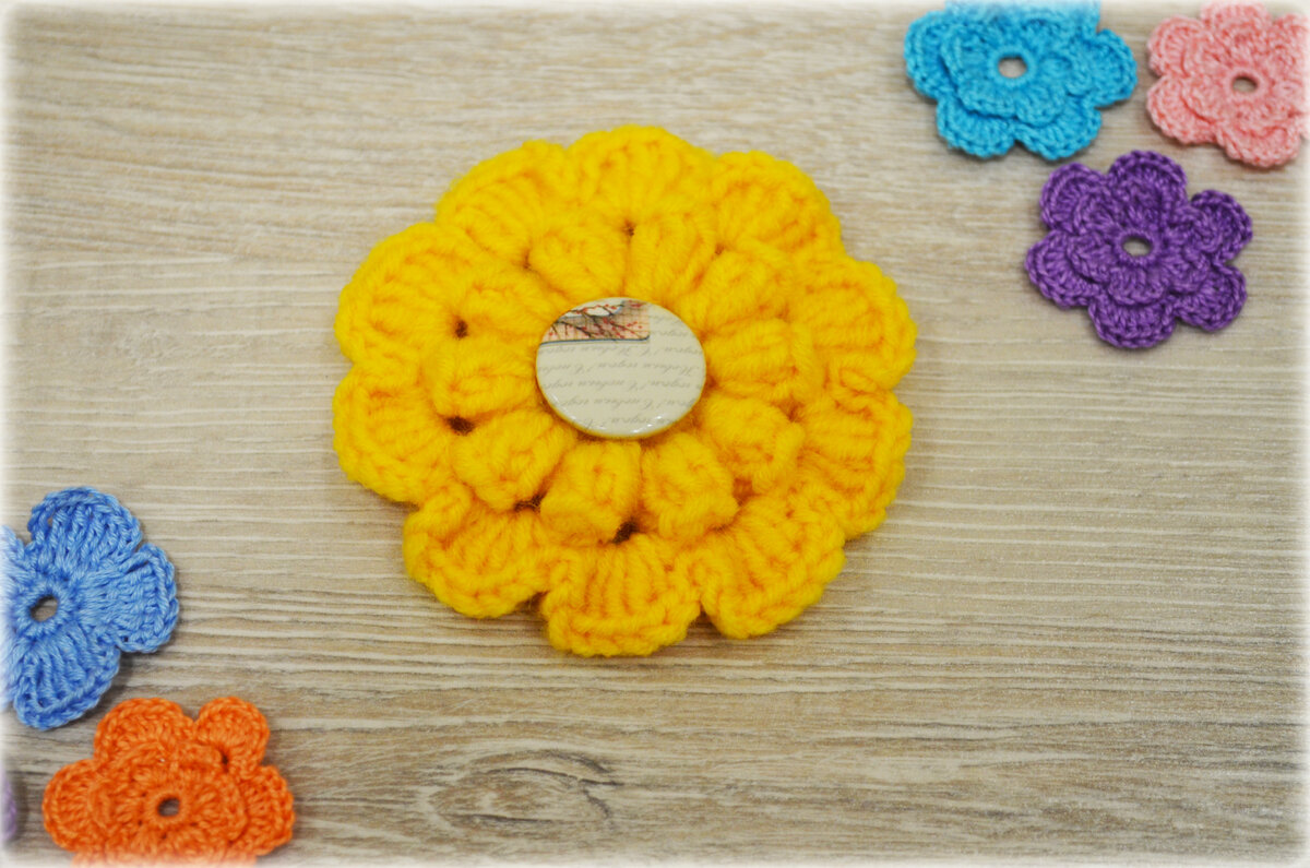 На дворе весна, так хочется солнышка, тепла и ярких красок. Сегодня будет МК по вязанию красивого солнечного цветка. Да,да, именно солнечного, потому что такой же большой и желтый! Это декор для будущей вещи! А вообще, вязаные цветы можно использовать везде. Видела даже идею использования их в качестве аппликации к детскому рисунку. А ведь это прекрасная идея для открытки! Вот он наш красавец! В центре! Я люблю вязать цветочки, ими я декорирую скрап работы. На фото видно, что их у меня много, все они разного размера и цвета. Размер цветка можно регулировать толщиной нити. Начнем наш МК! Сокращения: воздушная петля - в.п. соединительный столбик - соед.ст. столбик без накида -ст. б/н. столбик с накидом - ст. с/н. Делаем кольцо амигуруми 1 ряд: в это кольцо вяжем 20 ст. б/н., соединяем конец ряда соед.ст. Стягиваем кольцо. Поскольку я вязала из толстых ниток (ALIZE lanagold classic, крючок 3 мм), у меня получилась дырочка в центре, так я и задумывала (на фото я закрыла ее декоративной