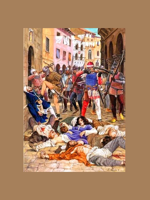 Наемники XIV века, кондотьеры, к которым обращались правители итальянских независимых городов, относились к гражданским с открытым презрением. Из источников мы узнаем о зверствах, которым подвергалось мирное население. Примером может послужить резня, устроенная в Чезене в 1377 году. В то время городом управлял Роберт Женевский, войско которого состояло из бретонских, английских и итальянских наемников. Зима 1376-1377 выдалась голодной, между кондотьерами и горожанами возникли трения. Жертвами очередной стычки стали несколько бретонских наемников. Роберт пытался урегулировать конфликт, примерно наказав горожан, посмевших усомниться в его власти. Подписывайтесь на телеграм-канал - t.me/battlez В город начали прибывать английские наемники Хоквуда и итальянские кондотьеры во главе с Альбериго де Барбиано. Поздней ночью 2 февраля 1377 года кондотьеры заблокировали ворота города и устроили невиданную резню. Шло массовое истребление всего городского населения, не жалели никого: ни женщин, н