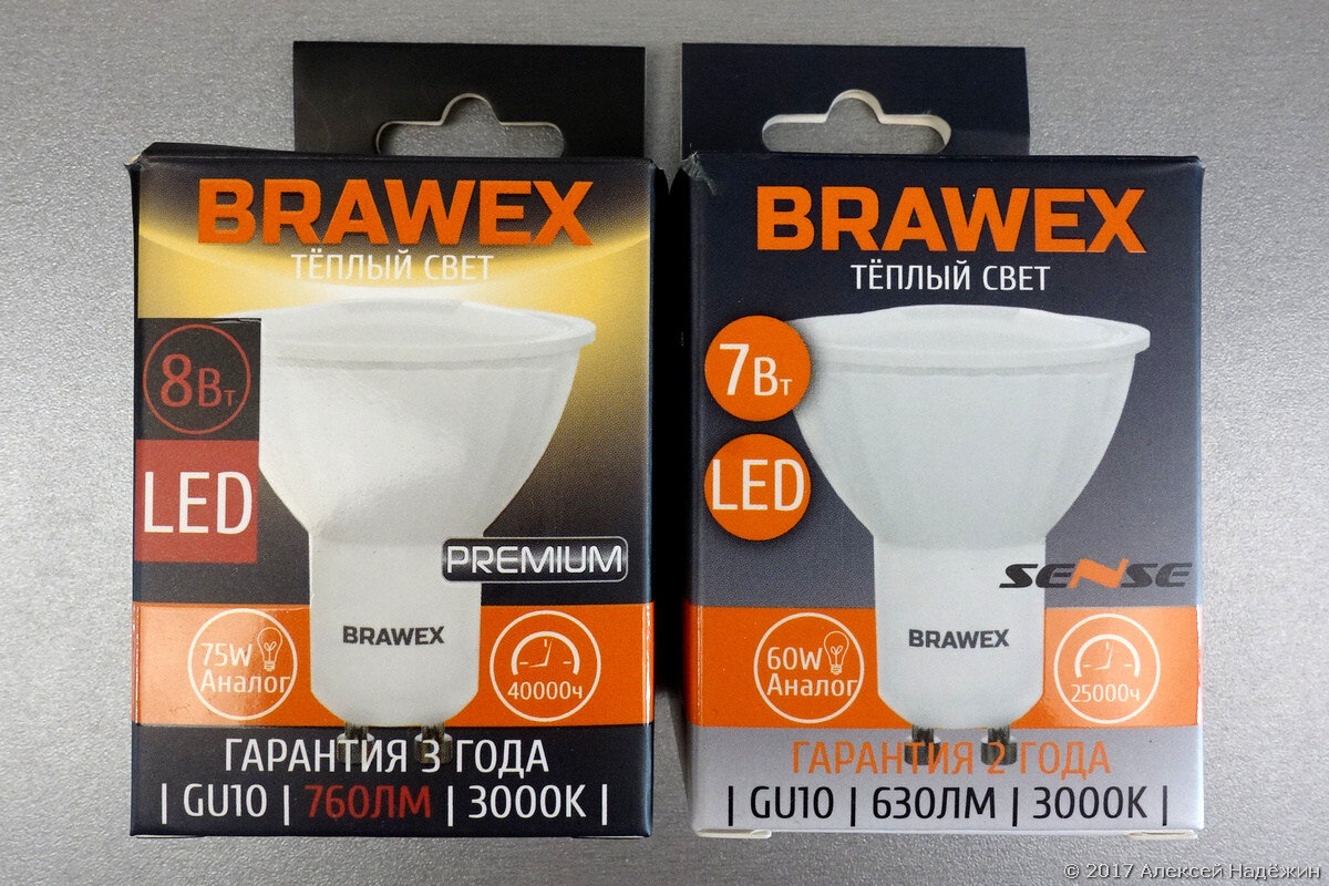 У Brawex две серии ламп - Premium и Sense. В лампах серии Premium используются светодиоды Epistar, у которых выше индекс цветопередачи и энергоэффективность. У лампы этой серии дольше заявленный срок службы и больше срок гарантии: 3 года на все лампы, кроме филаментных и два года на филаментные. У ламп серии Sense гарантия на разные модели ламп 1 или 2 года.