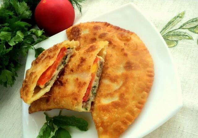 4 ст. муки 300 мл воды 3 ст.л. растительного масла 1 ч.л. соли Начинка: 300 гр. мясного фарша 1 луковица 4 помидора 100 гр. сыра соль, перец черный молотый зелень Муку всыпать в миску. В кипяток добавить соль, растительное масло и влить в муку, быстро замесить тесто, обернуть в пищевую пленку или положить в пакет , завернуть и оставить на 1 час. В мясной фарш положить мелко порезанный лук, посолить-поперчить, добавить также мелко порезанную зелень, добавить также немного воды, чтобы начинка была сочная. Все хорошенько перемешать. Нарезаем помидоры тонкими кружками, сыр натираем на крупной терке. Тесто разделяем на порционные шарики, раскатываем каждый, выкладываем по 2-3 ст.л. начинки на 1 половину, посыпаем сыром и выкладываем сверху кружки помидора. Накрываем второй половинкой, обрезаем по краям тарелки, чтобы получились ровные края. Залепляем, хорошенько прижав тесто, чтобы не сочилось. Жарим на раскаленном растительном масле до золотистой корочки. Готово! Подавать горячими! Прият