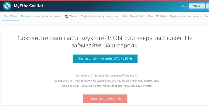 Если ты перешел сюда, значит тебе нужен ETH кошелек, куда будут приходить все твои токены полученные с AIR DROP-ов. Первым делом переходим на сайт: https://www.myetherwallet.com/ Вводим свой будущий пароль от кошелька и нажимает «Создать кошелёк» Советую придумать максимально сложный пароль, все таки кэш храним там. Не забудьте сохранить пароль в текстовый документ. Скачиваете файл с закрытым ключом на свой ПК. Закидываем в укромное место, а лучше на флешку. Этот файл является одним из способов открытия вашего ETH кошелька Нажимаем кнопку «I understand. Continue» Далее записываем наш «Private Key» (Можно в тот же файл куда записали пароль) Этот ключ нам пригодится для входа в кошелек. Нажимаем ниже серую кнопку «Сохраните Ваш адрес» Тут мы выбираем «Закрытый ключ» и вставляем наш ключ, который мы записали ранее. Никому не говорите и не показывайте этот ключ, с его помощью мы будем заходить в кошелек. Тут нажимаем кнопку «Отпереть» Вот и все, наш кошелек ETH созда