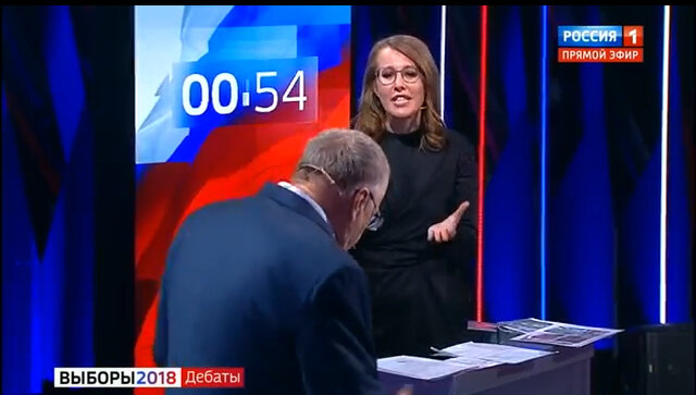 28 февраля 2018 года лидер ЛДПР Владимир Жириновский в грубой форме обругал Ксению Собчак во время записи предвыборных дебатов на канале «Россия 1» . Трансляция дебатов велась в прямом эфире на Дальний Восток, но после инцидента ее прервали и перенесли на час. В Москве дебаты должны выйти в эфир в 23:00. Конфликт между Жириновским и Собчак произошёл во время выступления другого кандидата в президенты Сергея Бабурина. Жириновский начал спорить с Бабуриным, из-за чего Собчак сделала ему замечание. В ответ лидер ЛДПР назвал Собчак дурой. Она плеснула ему в лицо водой, после чего Жириновский нецензурно выругался. "С улицы не надо сюда приводить базарных девок. Грязь это всё. "Дом-2", это там разврат был. Пусть заткнется", - заявил Жириновский. Ксения Собчак комментировала каждую реплику политика очень активно . (Запись инцидента можно посмотреть на ютьюбе.) Собчак потрясена произошедшим конфликтом. "Нахожусь под ярким впечатлением телеэфира с Владимиром Вольфовичем Жириновским. Мне даже