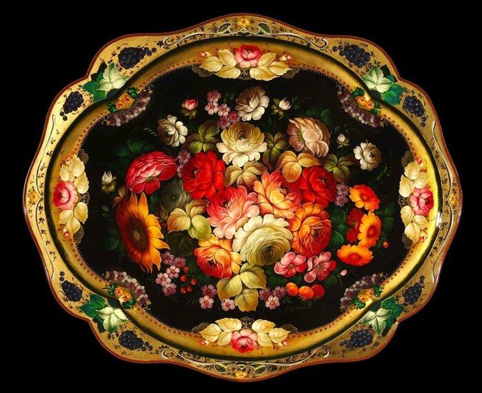 Расписные железные подносы — обычные предметы каждодневного использования и в то же время — настоящие произведения искусства, памятники культуры. Их жанровая живопись и манера художественного исполнения показывают различные стилевые исполнения в искусстве, моду, вкусы разных социальных слоев русского общества. Сцены мифологического и исторического характера, круг популярных тем из «народной жизни», изображение романтических пейзажных ландшафтов, роскошных букетов из садовых и полевых цветов, праздничных натюрмортов из груш, яблок и винограда — все это многообразие старинного художества можно встретить на железных подносах с лаковой росписью. Расписанные большей частью неизвестными сегодня художниками-живописцами и мастерами русского лакерного дела из крепостных «крестьян-промышленников» или «работного заводского люда», они сохранили для нас драгоценную информацию.