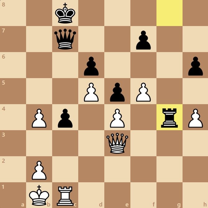 Эта позиция встретилась в реальной партии двух второразрядников. Только что черные сделали агрессивный выпад ладьей - на g4. Напали на нашу пешку и готовы продолжить атаку. Черные увлеклись атакой, но их король сам находится в бедственном положении. Ферзевый фланг черных разрушен. Этим мы и можем воспользоваться для победы! В задаче на тактику вы должны найти выигрыш. Это может быть либо мат, либо большой материальный перевес (например, выигрыш фигуры). Условие шахматной задачи: белые начинают и выигрывают. На размышление у вас две минуты. Проверить себя вы можете, найдя ответ под картинкой. Фе3-е2! Кто сказал, что вилку делает только конь? Пожалуйста, легендарный шахматный прием в исполнении ферзя не менее силен! У черных под боем ладья и пешка на с4. И дело не только в пешке - по линии "с" черный ферзь связан с черным королем и крупных потерь им уже не избежать. Черные решают сохранить ладью. Но мы, как и планировали, съедаем пешку на с4. Черные не могут увести ферзя, так как он св