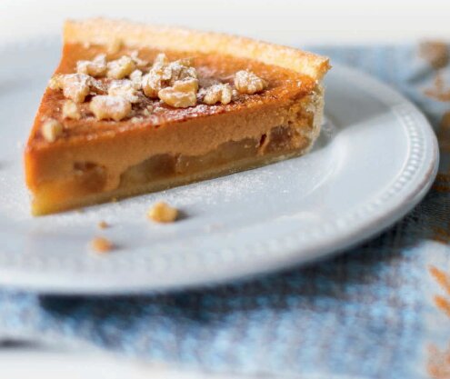 САХАРНАЯ ПУДРА ДЛЯ ПОСЫПКИ Для выпечки нужна форма диаметром 20 см Приготовление: 1. Для слоеного рубленого теста положите в комбайн муку, соль и масло, порубите в не слишком мелкую крошку. Добавьте ледяную воду и руками замесите тесто. 2. Слепите его в комок, расплющите и раскатайте на присыпанном мукой столе. Выложите в форму, срежьте края скалкой, наколите дно. Остудите в холодильнике. 3. Для начинки нарежьте яблоки кусочками. 4. Положите в сковородку сахар и поставьте на сильный огонь, дождитесь, пока сахар не начнет плавиться. Потряхиванием распределяйте сахар равномерно, чтобы о