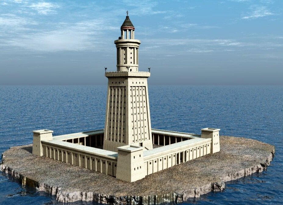 Самый древний и известный маяк на земле. Одно из семи чудес света. Он нес не только эстетическую и архитектурную функцию, но играл огромное значение для судоходства того времени. Располагался маяк соседнем острове Фарос. Поэтому иногда его называют еще Фаросским маяком. По историческим документам, когда Александр Македонский покорил северную Африку и Египет, он решил основать новую столицу –Александрию. Александрия быстро развивалась. Торговые корабли ходили друг за другом. Это были и малые корабли, и просто гиганты того времени. Именно тогда возникла острая необходимость в маяке. Заход в гавань был опасным и было решено о начале строительства маяка на острове Фарос. Величайший зодчий античности Сострат Книдский руководил проектом. Всего за пять лет, он смог спроектировать и воплотить его в жизнь. По некоторым данным, свет маяка был виден на расстоянии до 80 километров.! Это исполинское сооружение представляло собой башню, высотою 136 метров. Он состоял из трех ярусов. На верхнем н