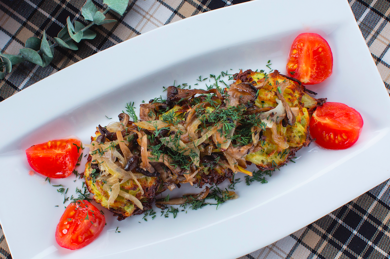 Ингредиенты: · Картофель очищенный - 150 г · Брокколи - 30 г · Мука - 10 г · Сливки - 70 г · Укроп - 3 гр (порезать) · Молотый перец и соль по вкусу · Масло растительное - 20 г · Вешенки - 60 г · Лук - 50 г · Помидоры слабо соленые - 50 г · Укроп - 2 г Приготовление: 1. Картофель и брокколи натереть на крупной терке. Добавить к ним муку и специи- замесить все в однородную массу. 2. Делим получившуюся массу на 3 равные части. Делаем 3 лепешки. 3. Берем лепешки и обжариваем их на растительном масле на раскаленной сковороде. 4. Выпекать драники 15-18 минут в духовке до полного приготовления при температуре 180 градусов. 5. Обжариваем вешенки с мелко нарезанным луком на растительном масле. 6. На тарелку вкладываем драники ,сверху выкладываем жареные грибы с луком. 7. При подаче украсить дольками помидора и рубленым укропом.