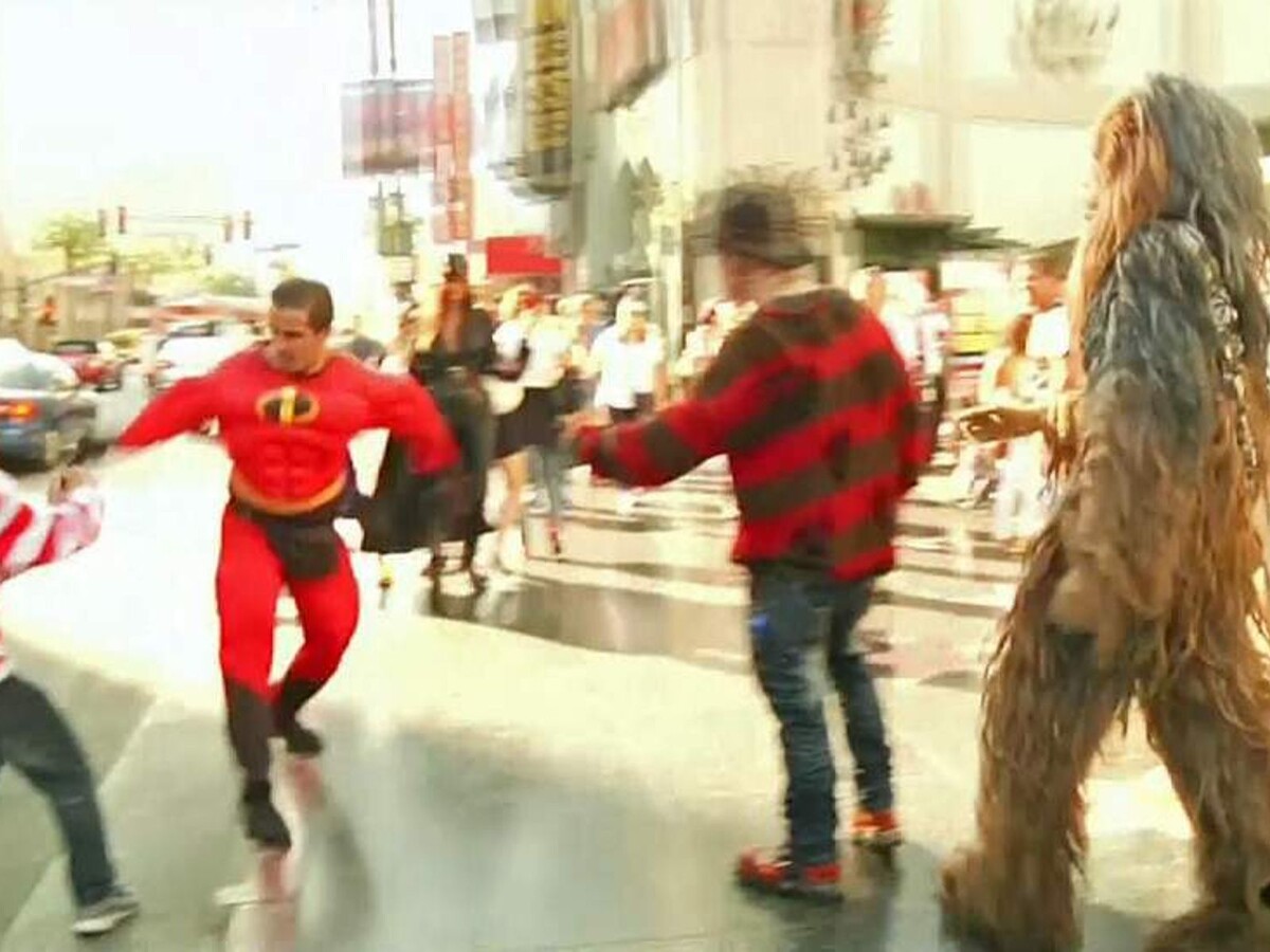 Одетые в костюмы Фредди Крюгера и Чубакки люди разняли дерущихся супергероев. В драке приняли участие Бэтгёрл и Мистер Исключительный, решившие выяснить отношения на голливудской Аллее славы. Интересно, что вокруг супергеройской потасовки моментально собралась толпа прохожих, но только переодетые персонажами фильмов люди решили принять непосредственное участие в инциденте. Спустя несколько минут к Чубакке и Фредди Крюгеру присоединились помощники — Королева Эльза и Уолли из комиксов «Где Уолли?». Причина конфронтации между Бэтгёрл и Мистером Исключительным осталась неизвестна. Ни один из участников потасовки серьёзных повреждений не получил.