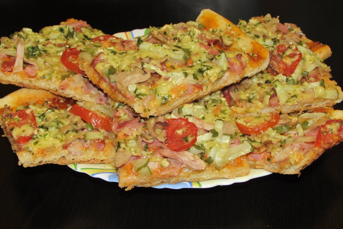 Сегодня я поделюсь с вами рецептом пиццы с очень вкусным тестом и начинкой. Сколько раз убеждалась и я, и всё моё семейство, вкуснее, чем моя домашняя, мы ещё не пробовали. Тесто настолько получается тонкое, с лёгкой хрустящей корочкой, просто пальчики оближешь. С начинкой иногда экспериментирую, но всё-же стараюсь придерживаться определённых традиций. Попробуйте, может и вам понравится) Понадобится: Для теста: (на 2 пиццы размером с противень) 500 грамм муки 1 пачка дрожжей для пиццы или обычные "Саф момент" 1 ч. л. сахара 0,5 ч. л. соли 2 ст. л. оливкового или раст. масла 300 мл воды орегано и базилик по щепотке (обязательно) Для начинки: 300 грамм охотничьих колбасок 300 грамм ветчины или любых других колбасных изделий 1 б. маринованных огурчиков 1 б. маслин без косточек 4 помидора 300 грамм твёрдого сыра 1 луковица майонез кетчуп приправа Итальянские травы или орегано, базилик соль перец по вкусу Приготовление: Тесто я замешиваю в хлебопечке. Если у вас нет, не составит никакого