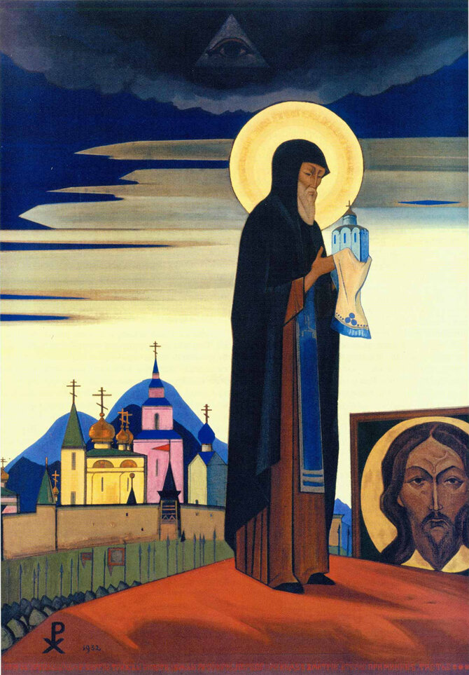 Как и у Нестерова, образ Сергия — один из центральных в творчестве Рериха. «Ты пишешь, — отмечает он в письме 1938 года к А. Бенуа, — что Твой патрон — Фома Неверный, а мой — Св. Преп. Сергий Радонежский. Помню, что, когда братия изгнала Преподобного из им же выстроенного монастыря, он нисколько не огорчился, но, взяв посох, пошел на новое строительство. В этом неутомимом строительстве заключено всепобеждающее творчество». Сергий высоко почитался в семье Николая и Елены Рерихов, которые видели в нем своего Учителя и всю жизнь строили по его заветам. Елена Ивановна Рерих под псевдонимом «Н. Яровская» написала прекрасный очерк «Преподобный Сергий Радонежский».