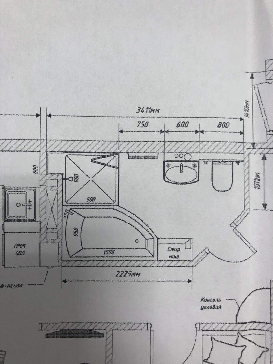 Здравствуйте! Мы купили квартиру, в которой делаем перепланировку. Сантехническую кабину старую мы сносим, так как состояние стен мягко говоря не очень, а соответственно строим новые стены по новым размерам. Архитектор, которая занимается нашей перепланировкой смогла сделать максимально большую ванную комнату, за счет коридора. Стояки переносить мы не можем, но поменять местами раковину или ванну - пожалуйста, и нам бы хотелось по максимуму задействовать пространство нашего санузла. В ванной комнате хотелось бы одновременно видеть как ванну ( угловую, небольшую), так и душ ( но не кабинку, а просто шторки стеклянные, а сама зона душа из плитки). Хотелось бы предусмотреть еще теплый электрический пол. Раковину стандартных размеров, над ней зеркало, можно шкафчик, но без открытых полок. в зоне ванной можно открытые полки из гипсокартона для шампуней и тд.. Унитаз - инсталляция, хотелось бы еще полноценную стиральную машину, и неплохо было бы предусмотреть сушилку - лиану. Шкаф, по типу пенала, если для него нашлось бы место, или просто подвесной шкаф, например над стиральной машинкой. потолок - натяжной. Хочется много яркого света. Прилагаю вам примерный план расстановки мебели, который если честно нам не очень нравится...