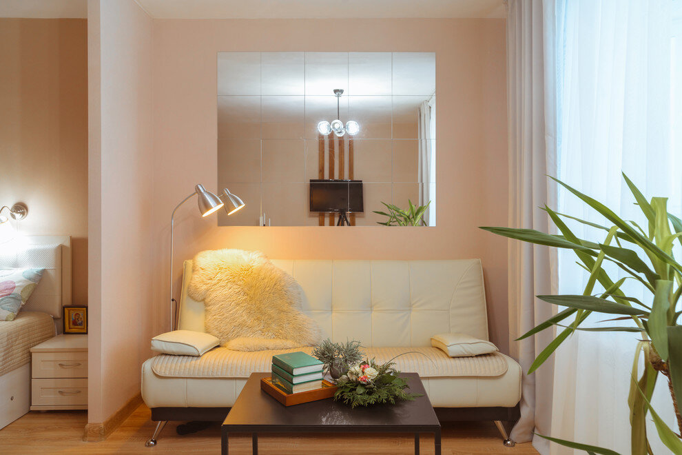 Дизайнеру Светлане Удзилаури предстояло найти место для спальни, детской, кухни и гостиной, но при этом уложиться в очень скромный бюджет. В условиях суперограниченного бюджета и площади упор сделали на удачную планировку. Владельцы квартиры не хотели спать на раскладном диване, поэтому прямо в гостиной обустроили крохотную спальню. Со стороны гостиной кровать отделяет небольшой простенок, со стороны прихожей – перегородка из реек. Чтобы она не так просматривалась и бросалась в глаза, здесь появилась картина с тропическим принтом. Тропическую тему поддерживает и юкка в кадке. А телевизор привесили на рейках – таких же, как те, что зонируют помещение. Для оформления интерьера выбрали традиционное сочетание песочно-бежевых тонов. Диван, журнальный столик и торшер нейтральны и по форме, и по стилистике, поэтому со временем их можно будет легко заменить, не прибегая к масштабному ремонту. А чтобы расширить пространство и отразить естественный свет, на стене за диваном создали