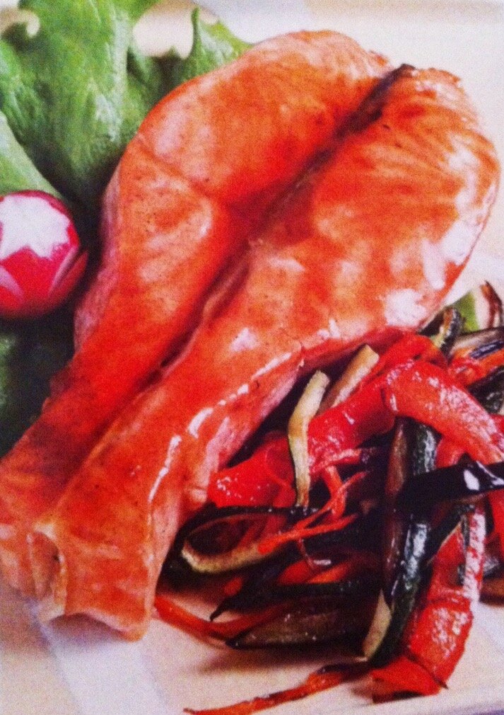 Праздник подразумевает наличие ярких блюд, украшающих стол. Блюдо из лосося, несомненно, не останется без внимания. Помимо завораживающего вида, блюдо удивит вас и ваших гостей своей пикантностью и оригинальным вкусом. Давайте приступим к приготовлению! Что потребуется для приготовления? Чтобы приготовить нежного лосося на 1 порцию нам потребуется: для лосося – 1 стейк лосося – 1 крупный лист салата – белый молотый перец – 3 ст. л. растительного масла – 4 ст. л. соуса терияки – соль для гарнира: – 1/4 баклажана – 1/4 цукини – 1 морковь – 1 болгарский перец – 2 ст. л. растительного масла – 1/2 ч.л. кунжутного масла – 1 ст. л. соевого соуса