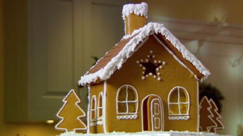 - Вырежьте заостренные концы коктейльных палочек в 1 см / ½ дюйма (у вас должно быть 12 маленьких остроконечных предметов). Надавите тупым концом кусочков коктейльной палочки на наклонные края передней и задней части дома, оставив заостренные концы торчащими выступами, чтобы действовать как опорные стойки для крепления крыши. (Не забудьте удалить острые коктейльные палочки из вашего пряничного дома перед едой, чтобы избежать удушья). Обледенение труб между коктейльными палочками и закрепление двух панелей крыши на дом. Обледенение труб вокруг основания и краев дымохода и прикрепление к крыше.
