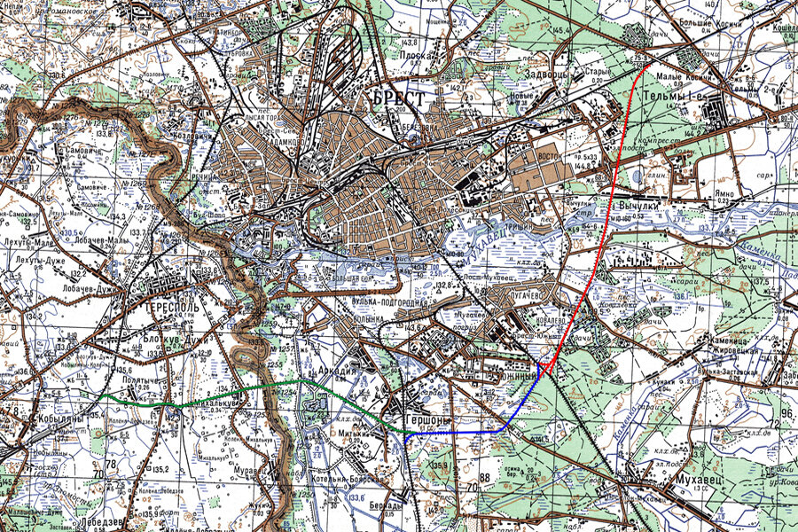 Ниже представлена карта, где видны железные дороги в Бресте. Важная проблема заключается в многочисленных реках: если уничтожить хотя бы один мост, можно прервать сообщение на южном, или, что значительно важнее, западном направлении. Для страховки на этот случай была построена окружная ветка. Сегодня она состоит из трех участков: разобранный (зеленый), использующийся (синий) и заброшенный (красный). Моста через пограничную реку Западный Буг нет, зато есть мост через Мухавец около деревни Вычулки.