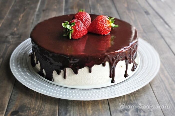 Для бисквита: 3 яйца, 3/4 стакана сахара, 3/4 стакана муки. Для сиропа: 1/2 стакана воды, 1 столовая ложка коньяка, 3 столовых ложки сахара. Для крема: 120 грамм сливочного масла, 1/2 банки сгущенного молока, 1 чайная ложка коньяка. Для суфле: 3 яичных белка, 1 стакан сахара, 1 столовая ложка лимонного сока, 100 грамм воды, 1 столовая ложка с горкой желатина. Для глазури: 100 грамм молочного шоколада, 100 грамм сливочного масла. Приготовление: 1) Готовим бисквит. Яйца взбить с сахаром. Постепенно всыпать муку. Вылить тесто в разъемную форму, смазанную маслом. Выпекать 35-40 минут при температуре 180 градусов. Готовый бисквит остудить, разрезать на два коржа. 2) Готовим сироп. Сахар с водой проварить на медленном огне до полного растворения сахара. Остудить, влить коньяк. 3) Готовим крем. Масло взбить со сгущенным молоком, добавить коньяк. Поставить в холодильник на 10-15 минут. 4) Собираем торт. На дно разъемной формы уложить корж, пропитать половиной сиропа и