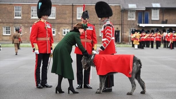 Выдавая веточки клевера 350 офицерам, герцогиня Кембриджская была рада от встрече с талисманом, Донхоллом, ирландским волкодавом. После парада принц Уильям наслаждался пинтой Гиннеса, а герцогиня выпила стакан воды, отмечает Vanity Fair .
