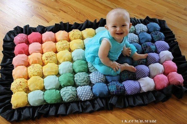 На нашем канале уже был мастер-класс по пошиву одеяла бом-бон. В этом МК мы сошьем коврик по тому же принципу, но с более простой схемой сборки. На таком коврике малышу будет тепло и уютно, он мягкий и на нем приятно лежать. Вы можете выбрать любую расцветку по вашему желанию. Особых навыков шитья здесь не требуется, с таким ковриком справится и новичок, тут главное желание и терпение. Нам потребуется: - материал из которого вы будете шить. Это может быть цельное полотно из которого нужно будет сделать квадратики, расход которых показан в видео, или, как вариант, готовая нарезка квадратиков с али-экспресс. - нитки в тон, - ножницы, - синтепон, - швейные булавки, - швейная машина. Ниже показаны вариации ковриков. Вместо рюша по краю коврика можно сделать петли из лент, за которые можно прикрепить игрушки малыша. Спасибо за просмотр нашего мастер-класса. Надеемся вам понравилось, ставьте лайк и подписывайтесь на н
