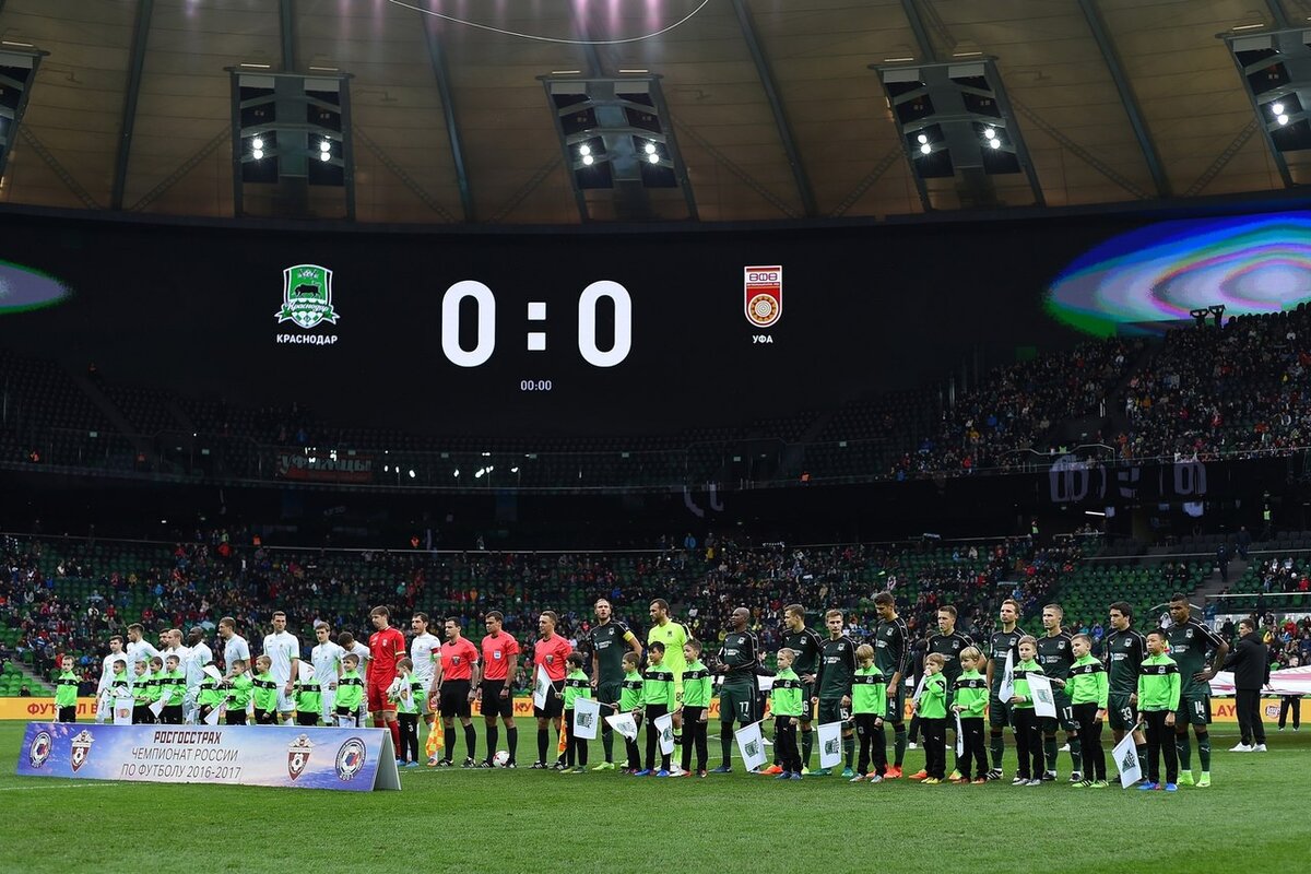 Уфимцы сохранили за собой шестое место в чемпионате России и приблизились к "Зениту". Между "Уфой" и "Краснодаром" много общего. Это самые молодые команды в РФПЛ - футбольный клуб "Уфа" основан в 2009 году, а "Краснодар" в 2008-м. Оба клуба пробирались в Премьер-Лигу через Профессиональную футбольную и Футбольную национальную лиги. У "быков" этот путь занял 3 сезона, а у "Уфы" - 5. В стартовом составе "Уфы" вышли Алексей Никитин, Дмитрий Живоглядов, Джемал Табидзе, Боян Йокич, Ионуц Неделчару, Веролюб Салатич, Иван Пауревич, Дмитрий Стоцкий, Иван Обляков и Дмитрий Сысуев. Место в воротах занял Александр Беленов. Уже на третьей минуте Олег Шатов выводит Павла Мамаева на рандеву с голкипером, но Беленов опередил Павла и забрал мяч себе. На 8 минуте опасный штрафной разыграли уфимцы – Иван Обляков закручивал мяч в створ, но Синицын уверенно сыграл на выходе кулаками и отбил мяч. И следом ответ "быков" - Неделчару в последний момент опередил Смолова и выбил мяч в аут. На 19 минуте Обляк