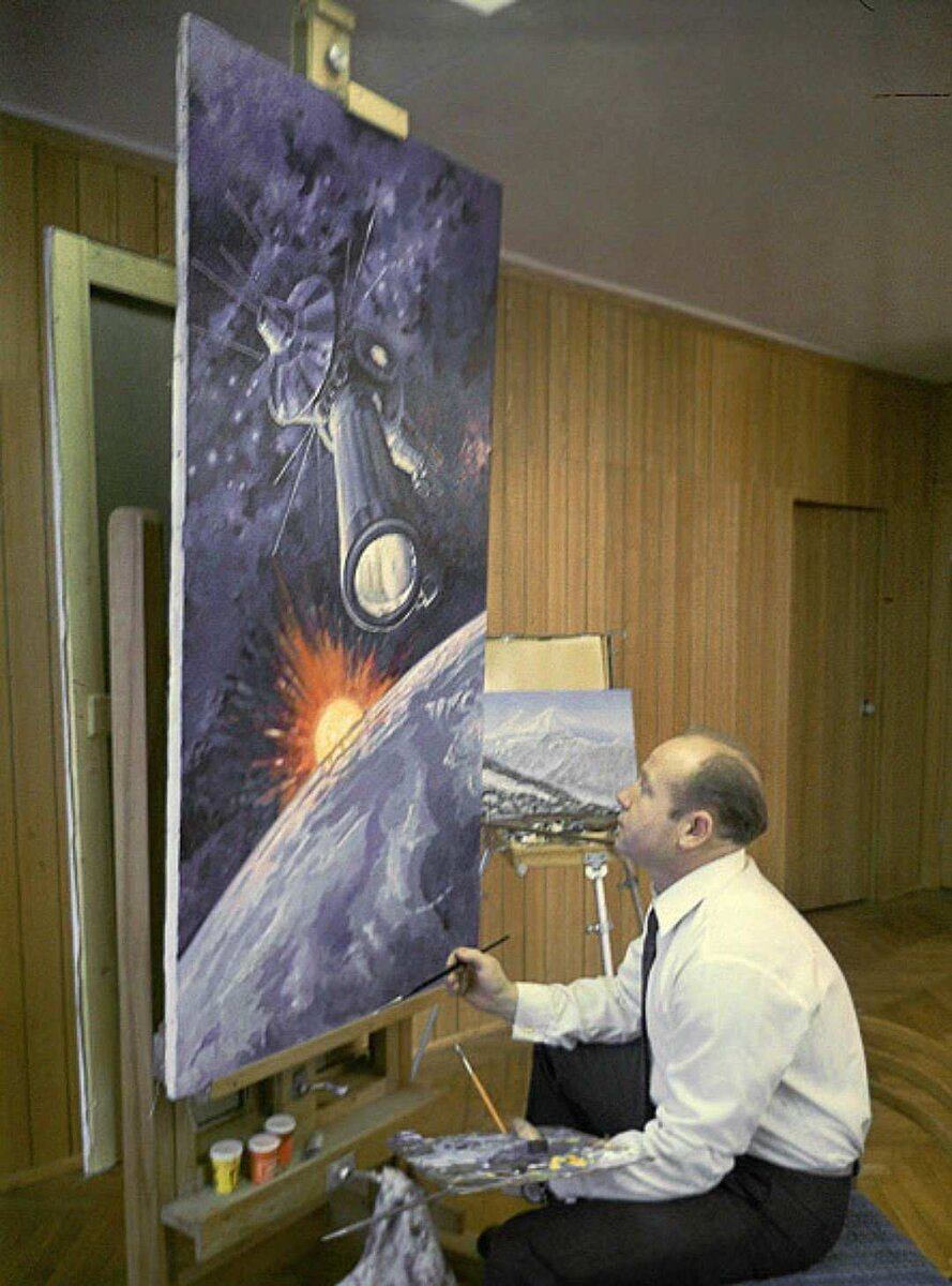 Алексей Архипович Леонов, советский космонавт, совершивший первый выход человека в открытый космос, участник двух космических экспедиций: Восход-2 и Союз-19 (Союз-Аполлон). Также Алексей Архипович - известный художник; в своих картинах он показывает космос через призму творчества. Творчество Алексей Архиповича можно разделить на три части. Часть 1. Полёт на Восходе-2 и выход в открытый космос. В картине «Над Черным морем» я постарался изобразить Землю такой, какой видел ее с высоты около пятисот километров. Район Черного моря выбран не случайно, ведь именно тут был осуществлен выход из корабля. Кроме того, здесь в поле зрения попадают самые характерные детали земной поверхности — море, горы, равнина. Хочется упомянуть особенность, характерную для Земли, какой ее видит космонавт. Все многообразие земных красок при взгляде из космоса всегда обобщено сиренево-голубой дымкой атмосферы. Выходим из ночи в утро. Видно, как начинает быстро светлеть горизонт. Яркая красная полоса опоясывает в