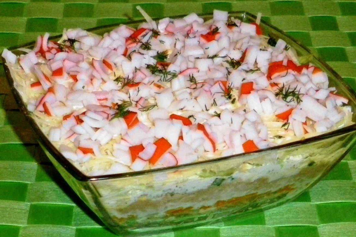 ИНГРЕДИЕНТЫ: Морская капуста - 100 г Лук - 2 шт. Яйца - 3 шт. Крабовые палочки - 120 г Консерва "Скумбрия" в масле - 1 банка. Краснокочанная капуста - половина кочана. Майонез - 300 г Петрушка - несколько веточек. ПРИГОТОВЛЕНИЕ: Капусту порубить и чуть посолить,память. Яйца отварить и мелко порезать. Лук нарезать соломкой. Крабовые палочки нарезать кубиками. Скумбрию помять вилкой. Салат выкладываем в глубокую салатницу слоями: 1 слой - морская капуста. 2 слой - лук. 3 слой - крабовые палочки. 4 слой - яйца. Полить майонезом. 5 слой - скумбрия. 6 слой - краснокочанная капуста. Полить хорошо майонезом. Верх украсить ( по желанию): крабовые палочки порезать колечками и сделать цветочки, к ним приложить веточки петрушки.