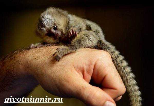 Игрунка это самая маленькая обезьянка. Примат поместится на ладони взрослого человека. Её рост без хвоста 11-15 см. Сам хвост длиной 17-22 см. Весит кроха 100-150 г. У этого животного длинная и густая шерсть.