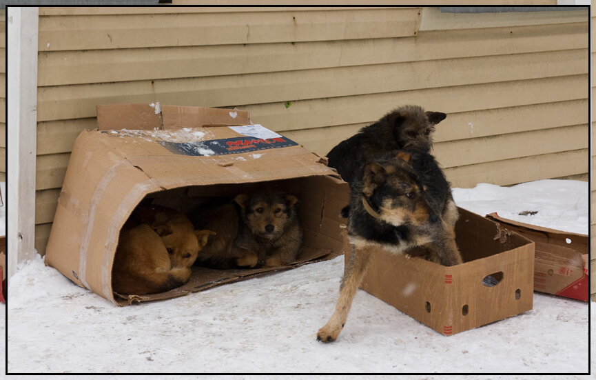 Остров Сахалин, небольшой город Холмск, февраль, уже целый месяц хоть и на улице небольшие морозы, но из-за сильного промозглого ветра с побережья эти морозы ощущаются как все минус сорок. В этих условиях выживают бездомных собаки, которые нашли единственное укрытие, это перевернутую на бок коробку. Эти четыре собаки живут рядом с мусорной площадкой магазина, с едой вроде проблем нет, они роются в баках, а вот где можно укрыться негде. В январе они жили в перевернутой на бок большой коробке и спали там по двое. В феврале собаки смогли найти еще две маленьких коробки, которые использовали что бы просто укрываться от ветра и ждать очередь, что бы залезть под большую коробку. В этой истории все таки хороший исход, в марте всех четверых собак силами местных жителей, забрали в добрые руки в частные дома. Теперь молодые псы очень счастливы и благодарны своим новым хозяевам. Берегите своих любимых питомцев, а если понравилась моя история, я буду очень счастлив: если ты поставишь лайк и подпи
