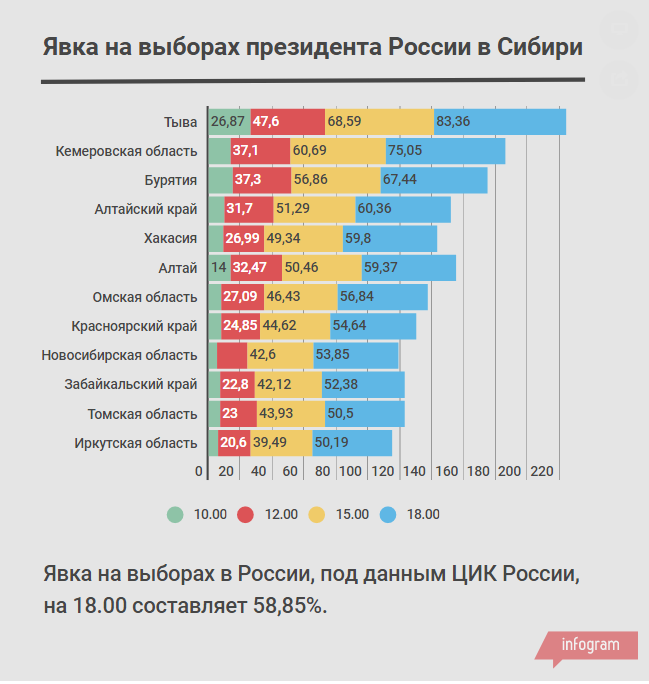 В числе аутсайдеров по явке, кроме Иркутской области, — Карелия (51,26%) и Тверская область (51,68%). В лидерах — Ямало-Ненецкий автономный округ (84,86%), Тыва (83,36%) и Кабардино-Балкарская республика (83,33%). Четвёртое место занимает Чеченская республика с результатом в 78,11%. Общая явка в России на 18.00 составила почти 60%.