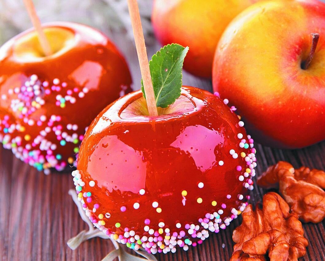 Красивым и вкусным украшением пасхального стола могут стать "Карамельные яблочки"! Вам понадобится: 1) Маленькие кислые яблоки - 5 шт. 2) Сахар - 250 гр. 3) Мед - 20 гр. 4) Вода - 50 мл. 5) Ванилин - 1 пакетик 6) Корица молотая - 1/4 ч.л. 7) Красный краситель - 5 капель 8) Китайские палочки для еды, прутики с листьями, декоративные палочки (для нанизания палочек и их красивого оформления) Приготовление: 1. Яблоки помойте, вытрите насухо и насадите на палочки; 2. Подготовьте застеленный промасленной бумагой или тефлоновым листом противень; 3. Воду, ванилин, корицу, краситель, мед и сахар перемешайте в кастрюле; 4. Доведите смесь до кипения и продолжайте нагревать до загустения постоянно помешивая; 5. Снимите готовую карамель с огня и быстро перемешайте, чтобы пузыри осели; 6. Каждое яблоко обмакните в карамель и оставьте охлаждаться. Совет: Обмакивайте яблоки очень быстро, так как карамель быстро густеет. Украсить яблоки можно посыпав их сладкой присыпкой и нанизав на декоративные пал
