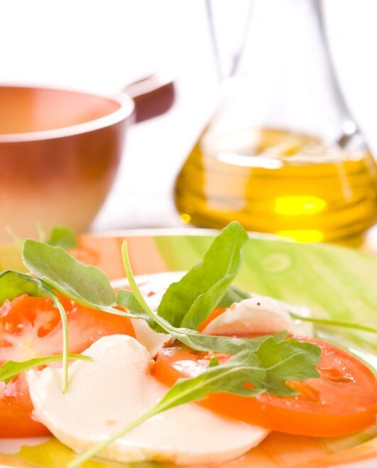 2. Выложите на тарелочку помидоры, а сверху моцареллу.