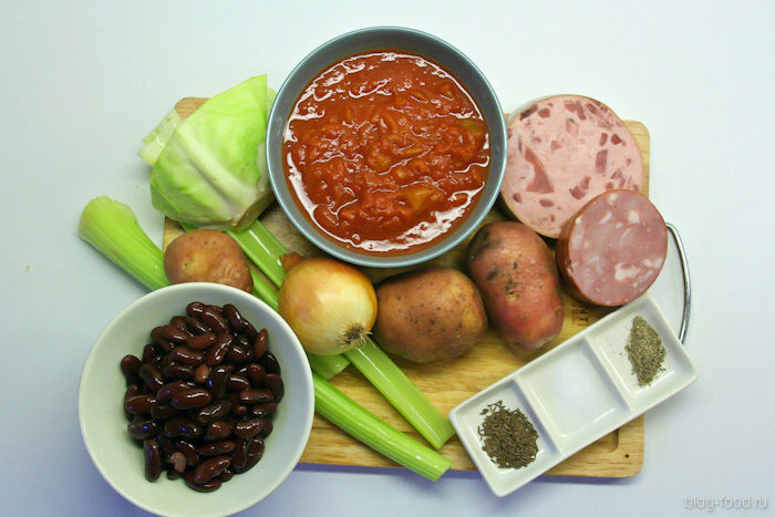 Добрый день! Всех представительниц прекрасного пола с праздником, а сильная половина человечества — марш на кухню варить настоящий мужской суп )). Речь сегодня пойдёт об аналоге нашей солянки, но в немецкой интерпретации — с тмином, фасолью и сельдереем. Для реализации всего этого нам понадобится: Берём картошку, лук и сельдерей и режем мелкими кубиками: Далее шинкуем капусту: Кладём овощи в тёплый бульон, добавляем тмин, доводим до кипения и варим 15 минут: Попутно режем теми же кубиками колбасу: В бульон с овощами добавляем помидоры: Варим ещё минут десять: Добавляем фасоль и варим минут пятнадцать: Наконец, кладём в суп колбасу, пробуем, солим, перчим и варим последние 4-5 минут: После чего разливаем по тарелкам и подаём на стол: Приятного аппетита!