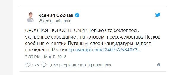 Ксения собчак заявила в Twitter, что на экстренном заседании пресс-секратарь Дмитрий Песков сообщил о снятии кандидатуру Путина с Выборов.